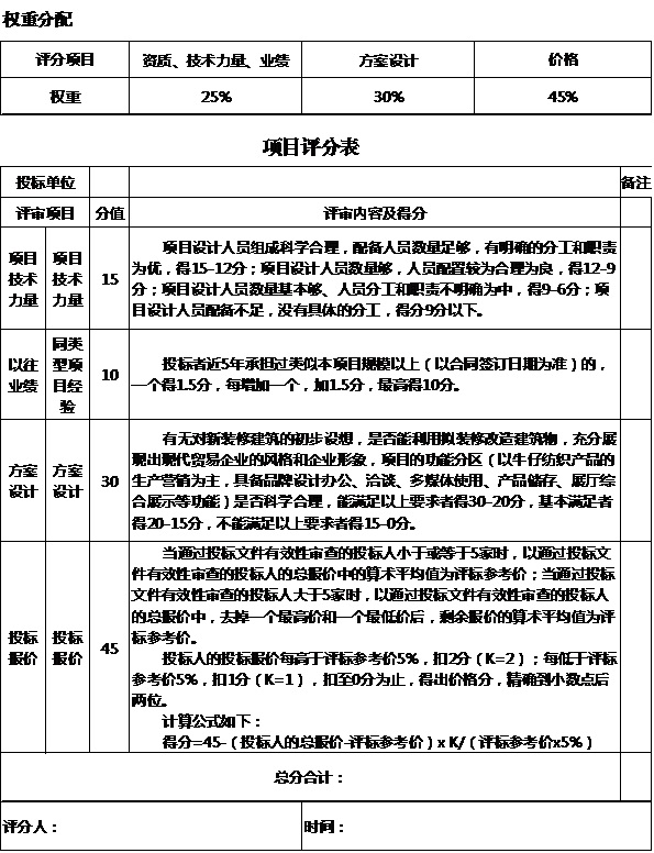 十三、本招標項目以評分權(quán)重分配原則進行評標,評分項目含有資質(zhì)、技術(shù)力量、業(yè)績,占比25%;方案設(shè)計,占比30%;投標價格,占比45%。以綜合得分高者中標。項目評分表詳見附件。