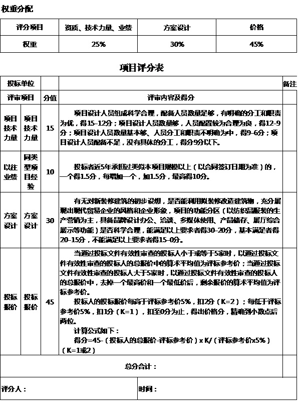 十三、本招標(biāo)項目以評分權(quán)重分配原則進(jìn)行評標(biāo),評分項目含有資質(zhì)、技術(shù)力量、業(yè)績,占比25%;方案設(shè)計,占比30%;投標(biāo)價格,占比45%。以綜合得分高者中標(biāo)。項目評分表詳見附件。