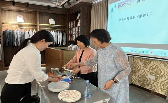 本次活動特邀非遺企業(yè)廣州市老山香業(yè)貿(mào)易有限公司的莊老師和周老師進行現(xiàn)場教學。老師們系統(tǒng)介紹了香道文化的歷史脈絡與精神內(nèi)涵,闡述了香道與“衣食住行”、中醫(yī)藥、美學文化及個人修養(yǎng)的密切聯(lián)系,并重點講解了宋代篆香的文化淵源與操作禮儀。