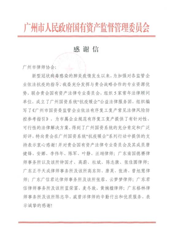 服務(wù):充分發(fā)揮專業(yè)優(yōu)勢,助力復(fù)工復(fù)產(chǎn)。紡織公司汪翊律師作為廣州市律師協(xié)會(huì)國有資產(chǎn)法律專業(yè)委員會(huì)的成員之一,積極投身廣州國資系統(tǒng)“抗疫暖企”公益法律服務(wù)團(tuán),參與編寫了《廣州市國資委監(jiān)管企業(yè)依法有序復(fù)工復(fù)產(chǎn)常見法律風(fēng)險(xiǎn)防控參考指引》, 并得到廣州市國資委的誠摯感謝。
