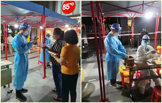 4月28日,正當(dāng)大家認(rèn)為廣州新冠病毒肺炎疫情情況已有所好轉(zhuǎn),滿(mǎn)懷期待準(zhǔn)備迎接“五一”假期之時(shí),不料廣州又有了新增本土確診病例。當(dāng)天下午荔灣區(qū)金花街負(fù)責(zé)組織募集核酸檢測(cè)志愿者的工作人員撥打手機(jī)找到紡織公司屬下廣州化工團(tuán)干部陳炯龍,負(fù)責(zé)人說(shuō):“小陳,我們街道晚上需要全員核酸,有空來(lái)參加嗎?”陳炯龍接到電話(huà)后沒(méi)有片刻猶豫,立刻答應(yīng)參加志愿服務(wù)。他想著今晚任務(wù)一定很重,要是多點(diǎn)人一起參加就好了,畢竟人多力量大??山拥饺蝿?wù)時(shí),已臨近下班時(shí)間,同事們大多有了各自的安排。他試探性地問(wèn)了之前和他一樣下沉白云區(qū)支援社區(qū)抗疫工作的團(tuán)員陳英東是否愿意同行。沒(méi)想到同為熱血青年的陳英東也立馬就答應(yīng)了!