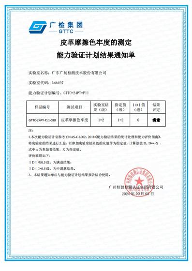 喜報(bào):廣紡檢測公司收到皮革摩擦色牢度的測定能力驗(yàn)證結(jié)果滿意通知單